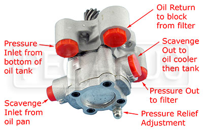 Looking at the pump installed on an engine (pressure relief adjuster at roughly the 6:00 position), clockwise from the left: Scavenge Inlet (from the oil pan), Pressure Inlet (from the bottom of the oil tank), Return to Block (pressurized oil exiting the filter), Scavenge Outlet (to the oil cooler and/or oil tank), Pressure Outlet (to the oil filter).