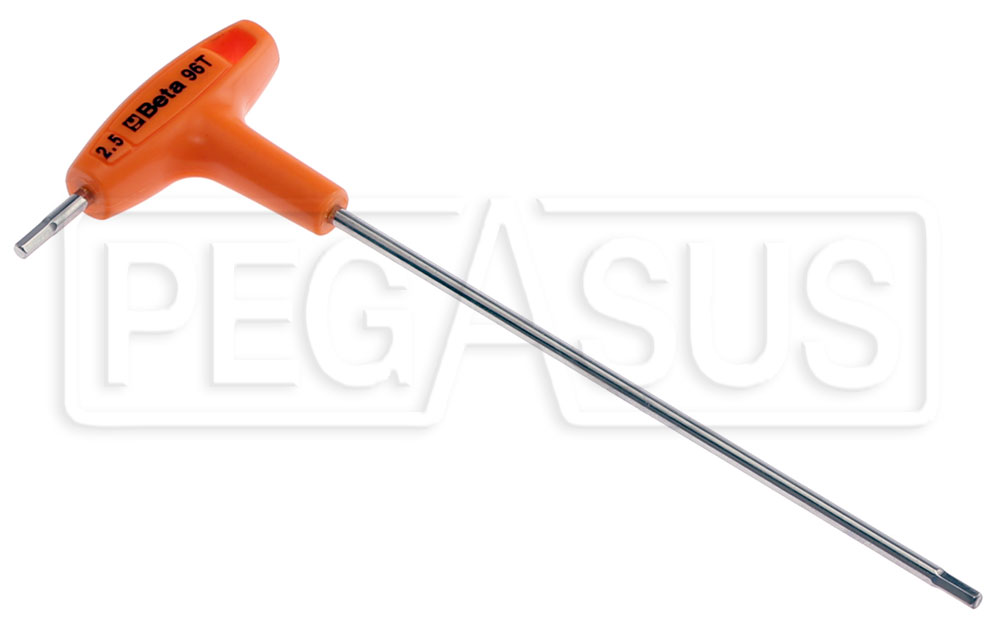The 96T Series hex key wrenches from Beta Tools feature distinctive bright orange T-handles that make them comfortable to hold while delivering high torque. Each wrench has a hex on the extended leg and the same size hex on one side of the handle. The opposite side of the handle has a hole for hanging on a hook or attaching a lanyard. The size of each wrench is printed in bold black numbers on the handle.