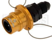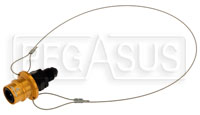 The Jiffy-Tite 2000 series will flow 1.75 GPM with a 5psi inlet pressure through a mated pair of valved fittings attached to 3 feet of -6 hose. Flow tests based on Stoddard solvent at 80°F. This fitting is valved; non-valved fittings are noted with an "A". A tug on the lanyard pulls the collar to release the socket. This can be used as a safety break-away on motorcycles or other vehicles where the tank may separate from the chassis in an incident.