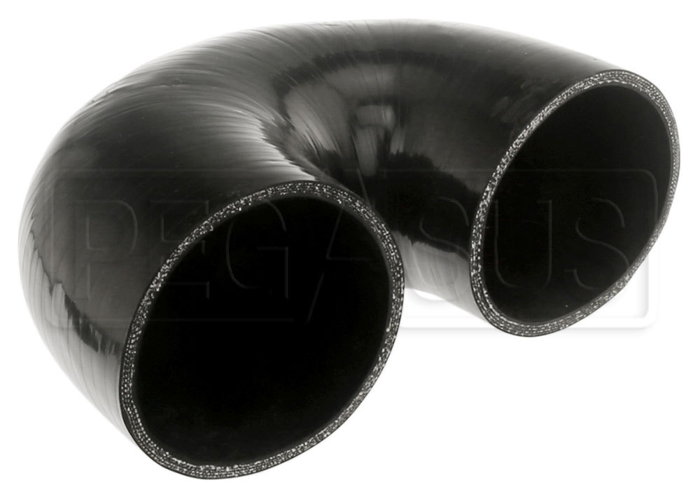 This 4" (102mm) ID 180 degree elbow hose is hand-crafted and quality inspected to the highest European standards. Black with a smooth, shiny "wipe-down" finish. Legs measure approximately 4 inches long (measured from the centerline of the U-bend). Leg spacing is 6" (150mm) center-to-center (3" centerline bend radius). The 4-ply reinforcement results in a working pressure rating in excess of 14 psi and a 5.5mm wall thickness (113mm / 4 7/16" OD). Use our Lined Hose Clamps (Part No. 3613-5.00) to clamp the hose over a 4" OD tube.