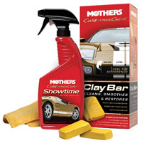 This all-in-one kit that includes everything you need to get started: Two 80g clay bars, a 16 ounce pump spray bottle of Mothers California Gold Showtime Instant Detailer, and a 15" x 15" microfiber towel. Using the spray detailer as a lubricant, simply slide a small piece of the clay over the freshly-washed paint and wipe off the excess detailer with the microfiber cloth. Knead the clay to expose a clean side and repeat. You'll be left with a perfectly clean surface.