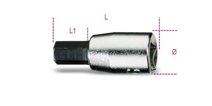 The male hex on this socket fits any standard 6mm hex recess. Measures 25mm long overall (L), 7.6mm long drive end (L1), 12mm diameter socket base (Ø). Weighs 11g. Sold individually.