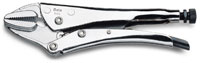 The 1054 self-locking pliers from Beta Tools have straight serrated jaws for traction on hard-to-grip objects. A knurled thubscrew on one handle adjusts the jaw opening, and a lever on the other handle releases the jaws when squeezed. The jaws and handles have a chrome-plated finish. The adjuster and release lever both have a tough black oxide finish.