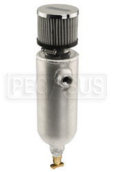To prevent spilling fluids on the track, most sanctioning bodies require transmission/transaxle breather vents to be routed into a catch bottle. This aluminum Breather / Catch Tank can be used to vent a dry sump tank, rear end, or any other application where a breather / catch tank is required.