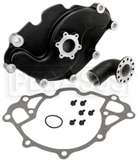 Kit includes an adapter plate with gasket and a bolt-on adapter elbow with O-ring and bolts. Fits 1966 and later Ford 289-351W small block engines. The 6-bolt flange on the elbow lets you set it up as a pre-1969 right inlet or a 1970 and later left inlet. 1965 and earlier engines require the later timing cover (C4AZ-6019-B for cast-iron pumps). Does not fit 1994 and later 5.0L engines.