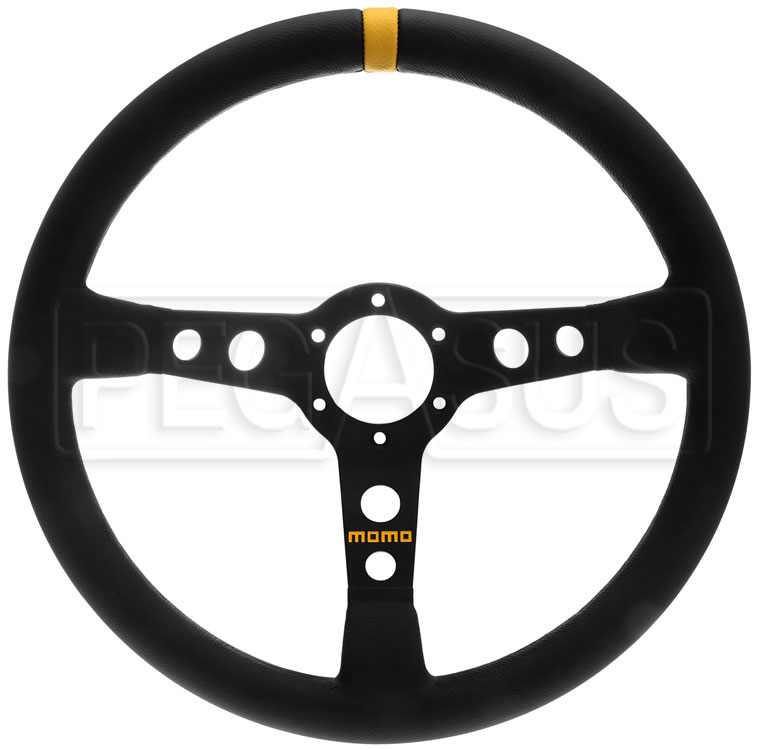 This dished three-spoke steering wheel features a classic design that never goes out of style. The black anodized spokes each have two lightening holes for an aggressive look. Measures 350mm (13.78") in diameter, 70mm (2 3/4") deep (measured from front of rim surface to back of hub). Covered in black smooth leather with a yellow centering stripe at the top of the rim. Includes horn button.