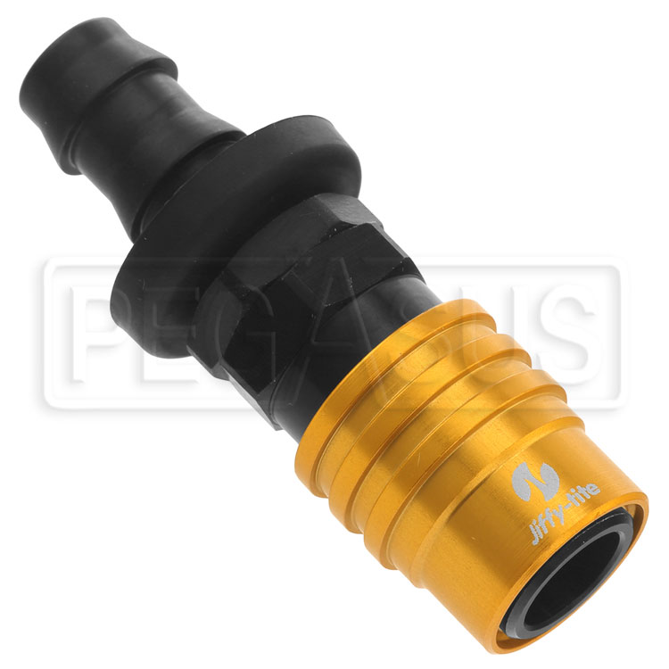 This socket fitting does not have an internal valve. It will allow fluid to flow when connected to a 2000-series Jiffy-tite plug or when disconnected. The hose barb is sized to accept a standard 3/8" push-lock rubber (non-braided) hose such as Aeroquip Pushlok or Earl's Super Stock. It will not work with stainless braided hose or PTFE-lined hose.