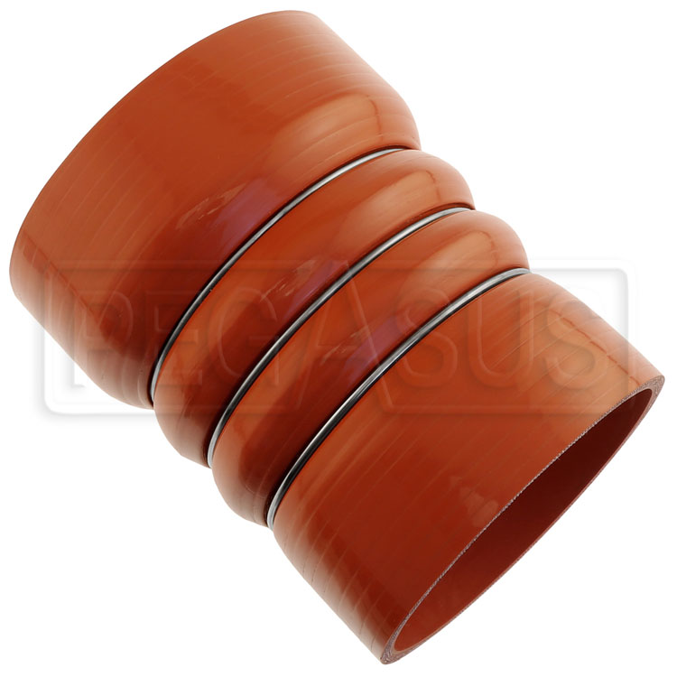This hose is a straight reducing coupler measuring 6 inches (150mm) long overall. It is designed specifically for connecting a 4 1/2" (114mm) OD metal intake pipe to a 4" (102mm) OD pipe, absorbing slight misalignment and vibrations. The 5mm wall thickness results in a 4 7/8" (124mm) OD at one end and 4.41" (112mm) OD at the other. Sold individually.