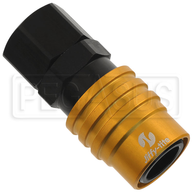 The Jiffy-Tite 2000 series will flow 1.75 GPM with a 5psi inlet pressure through a mated pair of valved fittings attached to 3 feet of -6 hose. Flow tests based on Stoddard solvent at 80°F. This fitting is valved; non-valved fittings are noted with an "A". The Jiffy-Tite 2000 Series Sockets will mate to any Jiffy-Tite 2000 Series Plug. They will not mate to the 3000 or 5000 series plugs.