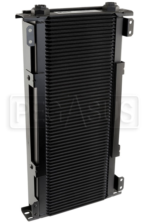 Setrab SSTD coolers are only available in a new "3 Series" width measuring 10.04" wide overall (8.19" without the mounting tabs) with female M22 ports spaced 6.57" center-to-center. The 1.97" thickness matches the Setrab STD series. The 60 row cooler measures 18.46" high (not including the fitting hexes) and adds approximately 1 quart capacity to your oil system. This Fanpack consists of the cooler with a shroud and two 6.5 inch 12 volt fans preinstalled. The steel shroud even has rubber-isolated mounting brackets built in. Black epoxy finish. Sold individually.