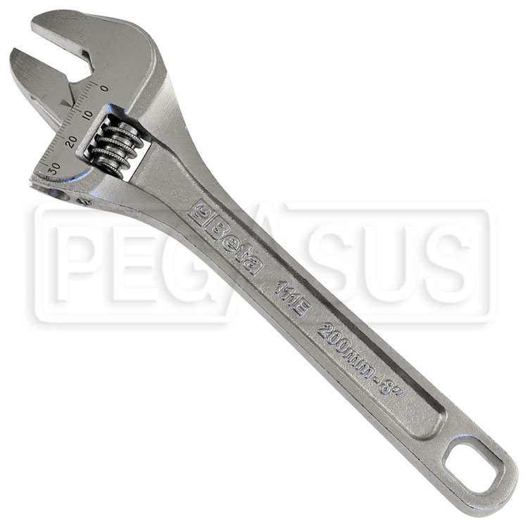 The 111E Series adjustable wrenches from Beta Tools work double-duty as a high-quality adjustable wrench, and as a quick and rugged caliper! When you tighten the adjustable jaw onto your fastener, the size of the fastener is shown on an etched scale (inches on one side, millimeters on the other). The scale is handy for sizing almost anything when you don't want to dig out your fragile dial caliper. The chrome plating looks great and resists corrosion. The head is angled at 15° to the handle for easier access.