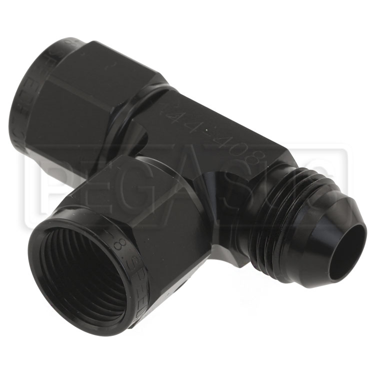 This special motorsport Tee fitting has one male 8AN (3/4-16, 37° convex flare) fitting at one end of the run and female 8AN swivel fittings on the branch and on the other end of the run. This design is ideal for branching a hose or accessory off of an existing male fitting. The swivel nuts allow you to tighten the fitting without turning the sealing seat, preventing flare damage. Black anodized aluminum. Sold individually.