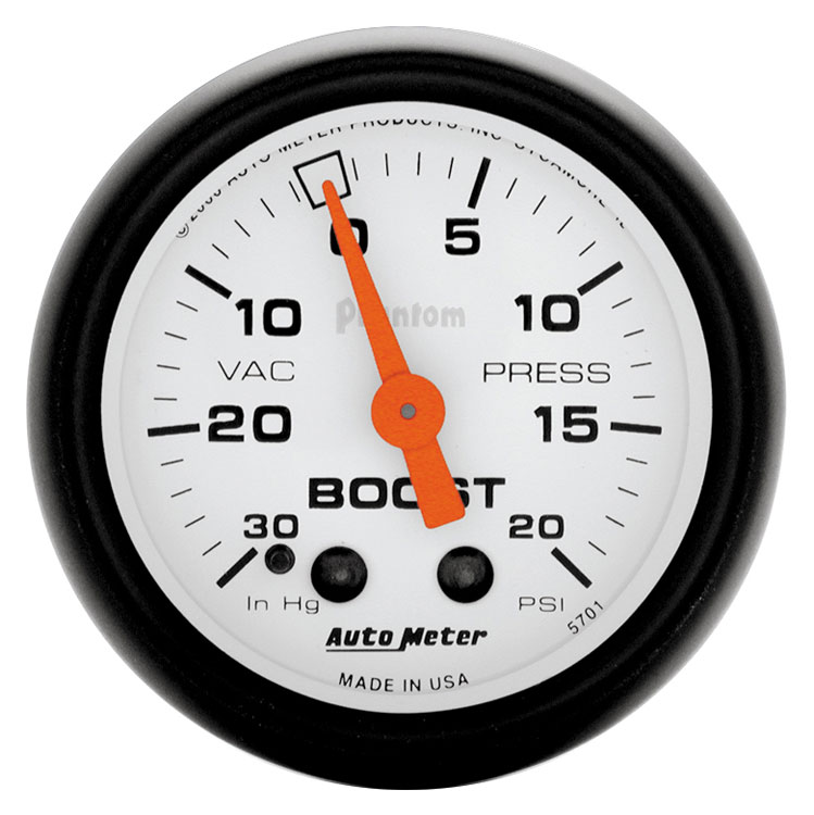 The Auto Meter Phantom series features bold looks, with a bright white face and black bezel. Black markings and a bright orange needle offer great visibility. The mechanical gauges are quality engineered with a full 270 degree sweep face.