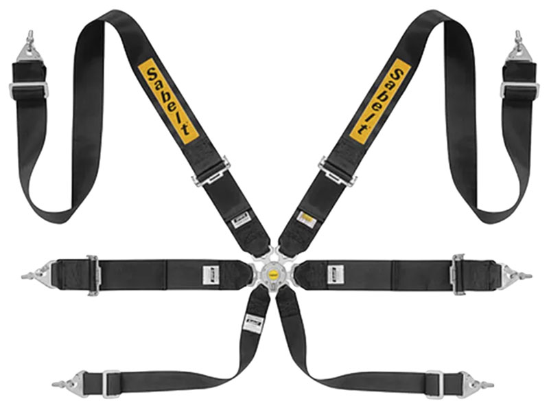 This 6-point 3x3 harness from Sabelt can be used in just about any sedan, whether or not the driver is wearing a HANS Device. The anti-sub straps are permanently sewn to the camlock buckle.